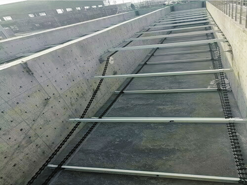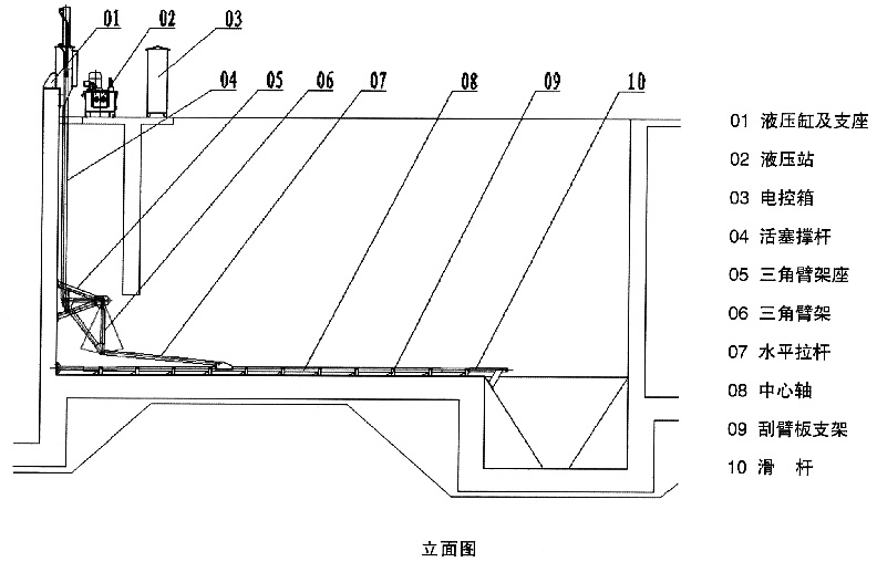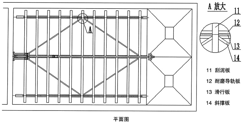油泵向液压油缸提供动力,一组三角架将油缸的竖直运动转换为水平运动、再带动一组楔形刮板在矩形池底作往复运动;往复运动的行程大于单根刮板的间距,相当于后一根刮板向前一根刮板传递污泥;刮板组前进的速度大约是后退速度的一半;前进时,楔形刮板的凹面在前、向池子的积泥沟推送积泥;后退时、很小的楔形锐角不会带动污泥向后运动、而快速后退的凹面产生的负压、会使一定厚度的污泥层保持向前运动的惯性。因此当刮板作往复运动时、池底有一层污泥始终在向前运动,直至跌入集泥沟。当池底积泥达到某一厚度时、刮泥机的效率较高。刮板的往复移动同时具有浓缩污泥的作用(可达3%),这种特性在实际应用中很重要。当排污量相等时、污泥的浓度越高、其耗水率越低,这样也就减少了水源与能源的损耗。