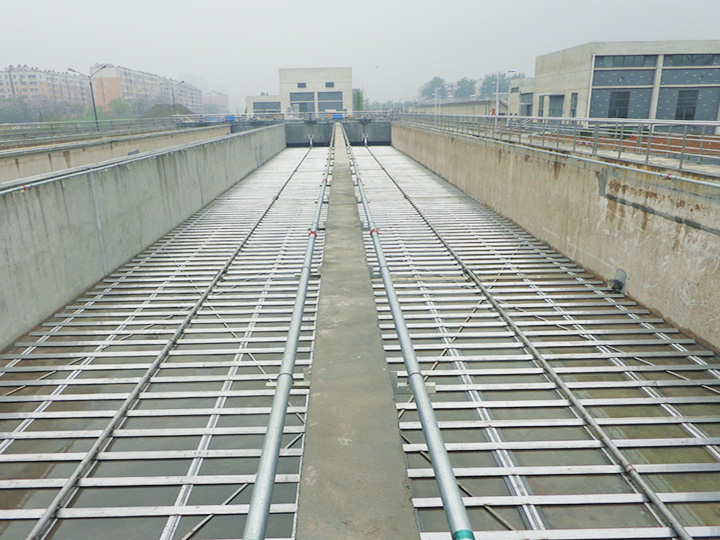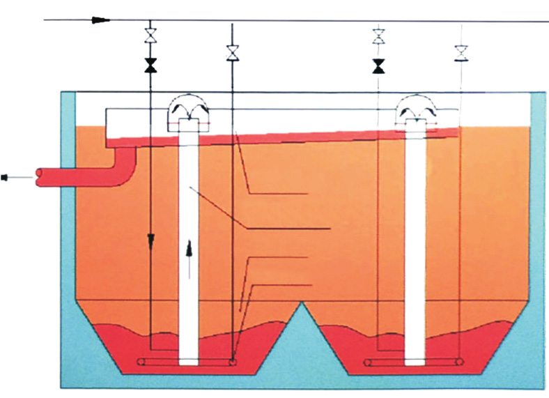 | 气提装置的结构 1、集泥沟内分隔为若干集泥斗。 2、每个集泥斗安装一根提升管,一套架桥破坏装置。 3、球阀F1常开,仅在检修电动球阀D1时关闭。 4、当沉淀池的制水量增加、沉淀池的进水浊度升高时,只需要及时调整气提排泥装置的工作周期。 | ![]() |