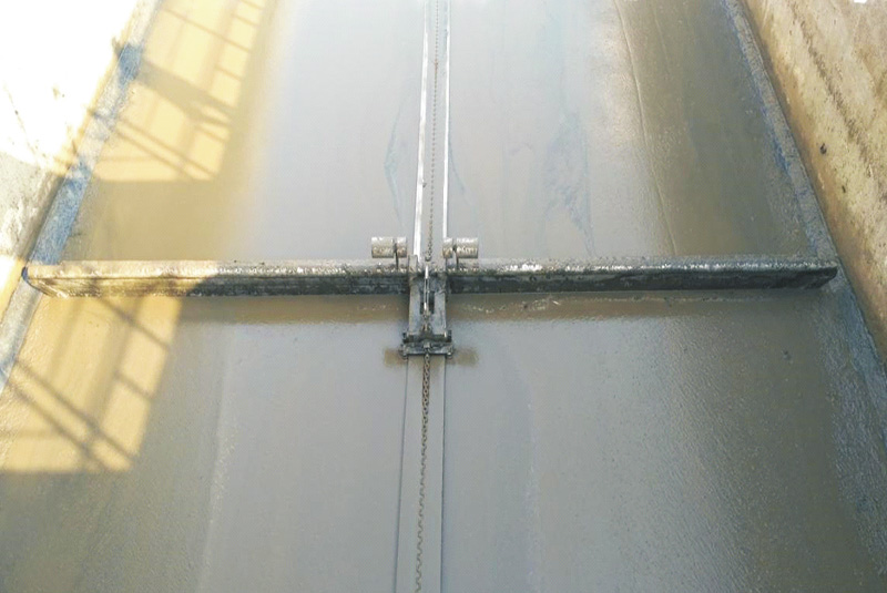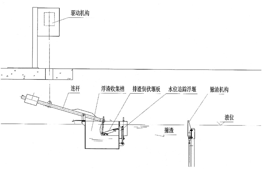 单轨式水下刮泥机,釆用一套环形链往返驱动装置,牵引刮泥小车作往(刮泥)返(复位)运动。将矩形平流沉淀池底的污泥从出水区刮向进水区域的集泥坑内集中排出,污泥排出浓度高、效果好。